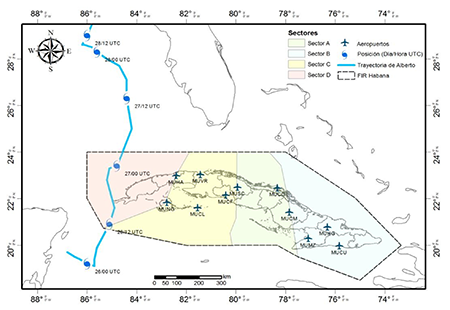 La FIR Habana se encuentra dividida por sectores para un mejor control del espacio aéreo, los que están delimitados tanto en la horizontal como en la vertical. Los mismos fueron utilizados para analizar la cantidad de sobrevuelos, y solo se contó con los datos de los sectores A, B, C Y D, pues el resto de los sectores ocupan el mismo espacio en la horizontal, solo cambia el nivel de vuelo (Figura 1).