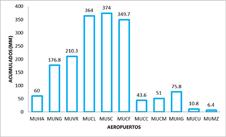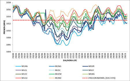 Esto se evidencia a partir de la caída de la presión atmosférica mediada al nivel de la estación reportada en los aeropuertos seleccionados para el estudio (Figura 2). El aeropuerto MUHA fue en el que se reportó la presión más baja (1005.8hPa) debido a la cercanía con el centro del meteoro.