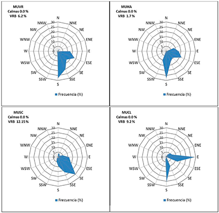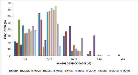 Los vientos sostenidos registrados en superficie sobrepasaron los 20kt (38km/h) solo se produjeron en MUCL como muestra la Figura 4, pero resultaron significativos los valores registrados por los anemómetros de los aeródromos donde la velocidad del viento osciló entre 15 y 19kt (28 y 36km/h), como es el caso de MUNG (19kt o 36km/h), MUCF (17kt o 32km/h) y MUHA (16kt o 30km/h). Solo se registraron rachas significativas en los aeródromos MUCF, donde ocurrieron 7 casos en que el viento superó los 20kt (38km/h). En MUNG y MUSC, se registraron las mayores rachas de los aeropuertos de estudio, las que fueron superiores a los 30kt (57km/h).