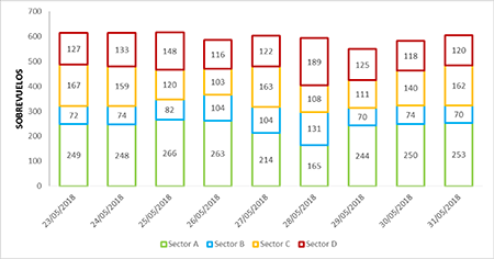 El número de sobrevuelos se mantuvo estable durante el paso de Alberto sobre la FIR Habana. Se incrementaron los sobrevuelos por el Sector B debido a que fue el que menos afectación directa tuvo del meteoro, mientras los sobrevuelos sobre el sector A disminuyeron los días 27 y 28 debido a que fue el sector donde mayor afectación de tormentas hubo, por lo que se realizaron desvíos para garantizar la seguridad de las aeronaves que transitaban sobre la FIR Habana (Figura 6)Figura 6 Cantidad de sobrevuelos por sectores de la FIR Habana entre los días 23 al 31 de mayo de 2018..