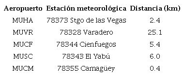 Los datos de las variables meteorológicas utilizadas para el estudio en los aeropuertos, fueron obtenidos del Banco de datos climatológicos de la ECNA, y para los datos de precipitación en los aeródromos de MUHA, MUVR, MUCF, MUSC y MUCM, fueron utilizados las estaciones meteorológicas del Instituto de Meteorología cercanas a cada aeródromo (Tabla 2).