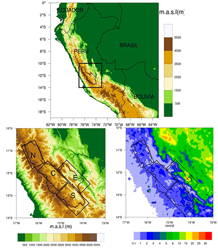 Los Andes centrales del Perú, y en particular la cuenca del Mantaro, son altamente vulnerables a los eventos extremos asociados a la variabilidad climática (Martinez Grimaldo et al., 2005). En especial, la precipitación es la variable de interés para la actividad económica en la agricultura, para la generación de energía y el abasto de agua para la población y las actividades económicas. A su vez la cuenca del Mantaro presenta una climatología de lluvia con estaciones seca y lluviosa bien marcadas, con valores máximos de lluvia que ocurren entre enero y marzo y valores mínimos entre junio y julio (Silva, Takahashi & Chávez, 2008). En particular, en el valle del rio Mantaro, donde se ubica el Laboratorio de Microfísica Atmosférica y Radiación (LAMAR) del Observatorio de Huancayo (OH), del Instituto Geofísico del Perú (IGP) la climatología de lluvia diaria presenta la estación húmeda entre setiembre y marzo, mientras la estación lluviosa comienza en agosto y termina aproximadamente en abril, con picos máximos entre enero y febrero, y la estación seca tiene lugar entre mayo y julio (Saavedra & Takahashi, 2017). Usando datos observados de precipitación diaria (Zubieta et al., 2017) determinaron que los eventos de alta y muy alta intensidad representan el 35 % de los días de lluviosos, a los que corresponde aproximadamente el 71 % de la cantidad de la lluvia total. Asimismo, la diferencias y similitudes entre la concentración y intensidad de la lluvia diaria sugieren influencia orográfica sobre la humedad que llega desde la Amazonia por encima de los Andes.