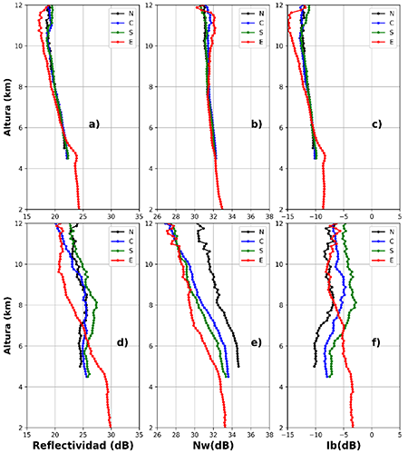 Como se mencionó anteriormente, el componente de la reflectividad Nw constituye el parámetro de escala que representa la concentración de los hidrometeoros, mientras que el componente Ib (dB) es una función del promedio de volumen en peso (Dm) y del parámetro de forma (µ). En la Figura (10) se muestra el promedio de perfil vertical de Ze, Nw y Ib para lluvia estratiformes y convectiva. En todas las sub-áreas, la concentración de hidrometeoros (Figura 10 b) entre 9 y 12 km de altura presenta máximos, aunque en las regiones de Andes los picos son menores. Esta es una evidencia de que en este intervalo existe alta concentración de partículas con diámetros muy pequeñas (Figura 10c). Luego a partir de 8 km hacia niveles bajos aumenta ligeramente la concentración de los hidrometeoros para todas las sub-áreas. La región E, presenta dos intervalos de aumento. Alrededor de 4.8 km de altura se observa un pico más pequeño, que se observa más pronunciado en la componente Ib (Figura 10c). Esta altura corresponde a la misma altura de la banda brillante, y además en esta misma altura la reflectividad tiene valores pico, de modo que evidencia que la banda brillante (Figura 10a) se encuentra alrededor de 4.8 km de altura. Asimismo, en la región E por de debajo de la ANC la reflectividad depende fuertemente del componente Ib, y se observa con claridad la región de banda brillante. Por lo tanto, para lluvia estratiforme, se afirma que el aumento de los valores de reflectividad por debajo de la ANC depende de la predominancia del tamaño de las partículas de hidrometeoros. En cambio, la concentración de partículas en la lluvia convectiva (Figura 10e), para todas las sub-áreas varía fuertemente en el perfil vertical. En la región N, la concentración es alta con respecto de otras sub-áreas y el Ib es ligeramente menor. Entre 5 y 11 km de altura existe una clara diferencia de valores de reflectividad entre las sub-áreas de los Andes y Amazonia-Andes (fig:10d). Los de los Andes presentan alta concentración de hidrometeoros y a su vez su tamaño disminuye significativamente. En la región E, la concentración aumenta fuertemente hasta llegar a la superficie y el diámetro aumenta ligeramente, Este resultado manifiesta que la reflectividad por debajo de 10 km de altura, depende de la predominancia de ambos componentes del Ze, aunque ligeramente domina la concentración de hidrometeoros en algunos intervalos de altura. El peso de lb es superior al de Nw, lo que refleja la existencia de gotas grandes, por la acción de los mecanismos de coalescencia entre gotas líquidas e incrustación de gotas de nube en cristales que dan lugar a formación de graupel en el interior de las corrientes ascendentes de las nubes convectivas. En la Figura 11 se muestran los perfiles medios de la reflectividad y sus componentes para nubes intensas de tipo CCI8. En la región N, para este tipo de nubes, la concentración de hidrometeoros es significativamente alta con respecto de las otras sub-áreas, aunque el tamaño de los hidrometeoros es menor que para las regiones C y S. En general la concentración se mantiene relativamente constante en todas las sub-áreas (Figura 11b), en cambio el tamaño de los hidrometeoros varía fuertemente. Por ejemplo, en las regiones de Los Andes entre 5 y 11 km de altura aumenta significativamente, lo que se refleja en que a esta misma altura la reflectividad aumenta y se observa una clara diferencia entre las regiones de los Andes y Amazonia-Andes. De este resultado se afirma que en las nubes más activas de tipo CCIs predomina el componente Ib (dB), lo cual indica que en las sub-áreas de Andes entre 6 y 10 km de altura la reflectividad es más sensible a la distribución del tamaño de partículas, mientras que en la región E, entre 4 y 9 km de altura predomina el efecto del tamaño de partículas, lo que revela una clara ocurrencia y predominancia de los procesos de coalescencia entre gotas e incrustación de gotas de nube en cristales de hielo que forman gotas grandes y partículas de graupel y granizo, lo que se refleja más claramente que en el caso de las nubes convectivas en general.