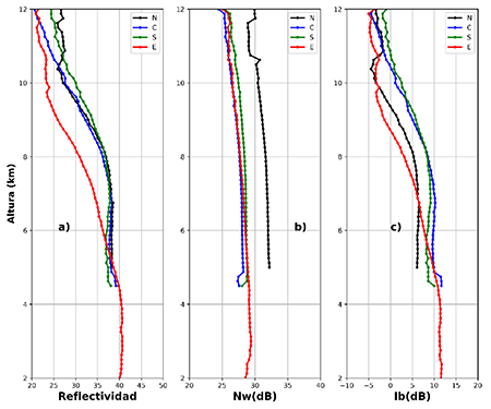 En el perfil vertical de las celdas convectivas predomina el componente de la distribución por tamaños de partículas, lo que indica que el factor de reflectividad equivalente es relativamente más sensible al tamaño de los hidrometeoros que a la concentración, con relación a sistemas estratiformes. En las nubes clasificadas como celdas convectivas intensas (CCIs) el predominio de la componente de tamaño es más marcada.