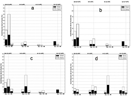 Tanto en Los Andes como en la Amazonia peruana, el período de máximos acumulados de lluvia se extiende principalmente entre los meses de diciembre y febrero (DEF), por lo que este será el período de estudio en el presente trabajo. La Figura 2 muestra el ciclo diurno de la precipitación para dicho período y la contribución relativa (%) a la lluvia acumulativa según las dimensiones horizontales de las zonas de lluvia y dependiendo del tipo de precipitación (convectiva o estratiforme). En la región N, las zonas clasificadas como Ss y S con lluvias convectiva y estratiforme, son los que más contribuyen al acumulado en horas de la tarde (18-23 UTC; Figura 2a). En este mismo intervalo, el número de sistemas de precipitación de tipo Ss son más abundantes (645) que los S (70) (en figura no se muestra). En cambio, en el horario entre 12-17 UTC, los eventos Ss son solo estratiformes, lo que implica que probablemente sean restos de anteriores sistemas convectivos en disipación, mientras que persisten algunos sistemas convectivos de categorías S. En región N, los porcentajes totales de ocurrencia de la lluvia convectiva y estratiforme son 30% y 70% respectivamente (en figura no se muestra) y su contribución al acumulado de lluvia está en relación 63% (convectiva) y 37% (estratiforme). Similarmente en la región C (Figura 2b) las lluvias con tamaños Ss y S son los que más contribuyen a la lluvia en horas de la tarde (18-23 UTC), en este mismo intervalo el número de sistemas de precipitación de Ss son más abundantes (680) que los S (50) (en figura no se muestra). Por otra parte, en el horario entre 00-05 UTC ocurre una importante contribución de lluvia de las categorías Ss y S, preferentemente, predominando la lluvia convectiva. En la región C, los porcentajes de ocurrencia de precipitación convectiva y estratiforme son 30% y 70% respectivamente (en la figura no se muestra) y la contribución al acumulado de lluvia es del 64% para la componente convectiva y el 36% para la estratiforme. Ligeramente cambia la configuración de la lluvia en la región S (Figura 2c). En el intervalo 18-23 UTC, correspondiente a la tarde, la contribución al acumulado de lluvia es de 59% del cual 38% es de lluvia convectiva y el 21% de estratiforme. Mientras que en el intervalo 0-5 UTC, correspondiente a la noche, es de 40.5%, de lo cual 26.5% es de convectiva y el 14% estratiforme. En esta región, los porcentajes de ocurrencia de la lluvia convectiva y estratiforme son 31% y 69% respectivamente (en figura no se muestra). Del total el 83% de la contribución de lluvia ocurre durante 18- 05UTC. De modo que este resultado, encontrado en las sub-áreas de los Andes (N y C) del porcentaje de ocurrencia de lluvia convectiva (30.5%) y su contribución acumulativa a la lluvia (63.3%) son consistente con los estudios de Zubieta, (2016). En la región E, (Figura 2d) la configuración de lluvia cambia por completo, ya que hay mayor contribución de lluvia en los intervalos 0-5UTC, 6-11UTC y 12-17UTC. En esta región los porcentajes de ocurrencia de lluvia convectiva y estratiforme son 31% y 69% respectivamente (en la figura no se muestra) y en total la contribución a la lluvia acumulativa está en relación 46% (convectiva) y 54% (estratiforme). De los cuales el intervalo 18-23 UTC solo representa el 15%, mientras que durante el período 00-05 UTC se aporta el 34%, este mismo porcentaje ocurre durante el intervalo 06-11UTC. Finalmente el 17% corresponde al intervalo 12-17 UTC. Lo que implica que el 85% de la contribución de lluvia ocurre desde las 0 hasta las 17UTC. Por lo tanto, el ciclo diurno de esta región es diferente con respecto de las sub-áreas de los Andes, en cambio la configuración del ciclo diurno es similar a la encontrada por Chávez & Takahashi, 2017 para otras regiones de la ladera este de los Andes.