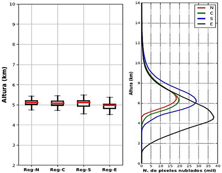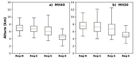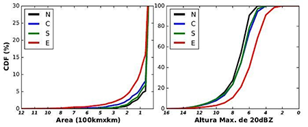 En la Figura (8) se muestra la climatología de altura máxima del tope de 40 dBZ (MH40) y 30 dBZ (MH30) determinado con 20 años de datos (1998-2018) combinados del PR y KuPR. El MH40 y MH30 son indicadores que se utilizan como proxies, para representar la intensidad de convección que se produce, de modo que indirectamente revelan la intensidad de las corrientes verticales que se generan dentro de una tormenta convectiva sobre todo por encima de la ANC. En la región E, los máximos de MH40 y MH30 se ubican en niveles relativamente bajos con respecto de las sub-áreas de los Andes, donde la mediana aproximadamente se encuentra a 4.4 km (MH40) y 6 km (MH30) de altura. En cambio, en las sub-áreas de Los Andes, los cuartiles son diferentes y las medianas aumentan en función de la altura. En la región S, la diferencia entre el cuartil inferior y el superior es relativamente grande, lo que indica que los MH40 y MH30 son más variables y la mediana se encuentra a 6 km (MH40) y 7 km (MH30) de altura. En cambio, en las regiones N y C sus cuartiles son estrechos y las medianas se encuentran a 7 km (MH40) y 7.5km (MH30), y 6.9 km(MH40) y 7.2km (MH30) respectivamente. El resultado muestra que la convección en todas las sub-áreas se produce a diferentes alturas, lo que indica que la topografía juega un papel fundamental. La Figura 9 muestra la función de distribución acumulativa (FDA) de ocurrencia de nubes convectivas (panel izquierda) y de la altura máxima de 20 dBZ (panel derecho). Se observa que la lluvia convectiva con área horizontal menor se encuentra en las sub-áreas de los Andes, observándose que a medida que aumenta la altitud, el área horizontal de lluvia convectiva disminuye. El FDA de la altura máxima de 20 dBZ muestra que en la región de transición Amazonia-Andes las nubes se ubican a una altura menor que en las sub-áreas de Los Andes.