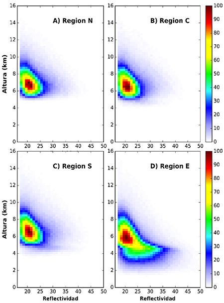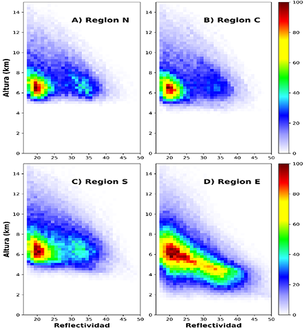 Es conocido que los valores más altos de Ze en niveles medios y altos de la troposfera corresponden a las velocidades verticales más intensas, y que la altura del máximo Ze en la distribución de frecuencia normalizada de dicha magnitud cambia para cada tipo de región, debido a que los procesos microfísicas dominantes son distintos (Xu & Zipser, 2012; Saikranthi et al., 2014). Por otra parte, la altura máxima de determinados umbrales de Ze para un sistema de nubes es un indicador fundamental del tipo de tormenta (Xu & Zipser, 2012). Partiendo de la estructura vertical de la reflectividad, Kumar, (2016, 2017b) encontraron que las regiones continentales y oceánicas presentan alta probabilidad de precipitación intensa sobre la altura del nivel de congelación (ANC), presentando diferencias en sus perfiles verticales de reflectividad entre 5 km y 12 km de altitud, de tal manera que las celdas continentales son más intensas que las oceánicas. La máxima altura de los ecos con Ze de al menos 20 dBZ es un indicador clave para conocer la altura limite en que las corrientes ascendentes pueden tener efecto de desviación en las partículas de hielo y precipitación, y la altura máxima de los ecos con al menos 40 dBZ es buen indicador de las intensidades convectivas o de la velocidad de la corriente ascendente (Cecil et al., 2005; Xu & Zipser, 2012).
