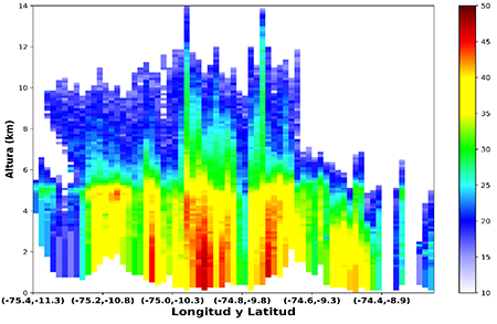 En la Figura 6 se muestra la estructura del SCM ocurrido el 26 de marzo de 2016 (16:30 UTC), que pudo ser observado por el KuPR. El SCM presenta aproximadamente 300 km de tamaño horizontal, y se distinguen claramente las 3 etapas de su desarrollo, la de formación, madurez y disipación. En el eje de las abscisas se indica la localización sobre la superficie (longitud, latitud), la tormenta muestra dos núcleos convectivos intensos de modo que cerca de las posiciones (-75.0,-10.3o) y (-74.8,-0.8o) se encuentra en su etapa madura, donde a 12km de altura, tiene valores de reflectividad que superan 20 dBZ y la base de la nube está por debajo de 3km de altura, mientras que en niveles bajos se observan valores de 45 dBZ, lo que revela la existencia de celdas convectivas intensas, por lo cual, en la presente investigación se clasifican como nubes de tipo CbT. En cambio, en la posición (75.2,-10.8o) se encuentra en etapa de disipación relativamente con nubes poco profundas y con una señal de banda brillante que evidencia la precipitación estratiforme.