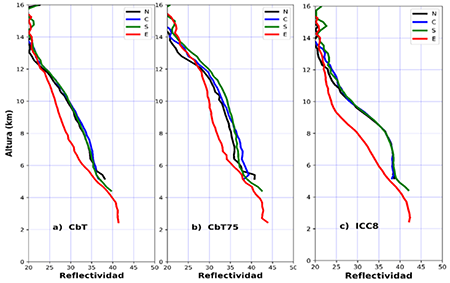 En la Figura 7, se muestra el promedio de perfil vertical del Ze para todas las nubes de tipo cumulunimbus (CbT) (Figura 7a); para las CbT que rebasan el percentil 75 en la distribución por valores de Ze (CbT75) (Figura 7b) y para las celdas convectivas intensas utilizando 8 km como altura de referencia (CCI8) (Figura 7c)