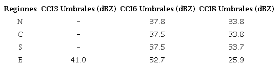En la región E a 3 km de altura de referencia, la reflectividad toma el valor de 41 dBZ. En cambio, en N, C y S no se definieron debido a la topografía de los Andes, aunque sí se tiene umbrales para CCI6 y CCI8 lo que indica que los umbrales son cercanos entre las regiones de los Andes y difieren para la región E. De aquí se afirma que los umbrales varían, dependiendo de la altura de referencia fijada, lo que es consistente con los resultados de Kumar & Bhat, (2016). Estos valores son indicadores para cuantificar la intensidad de eventos asociadas a sistemas de nubes profundas y de tormentas convectivas.