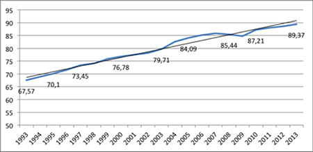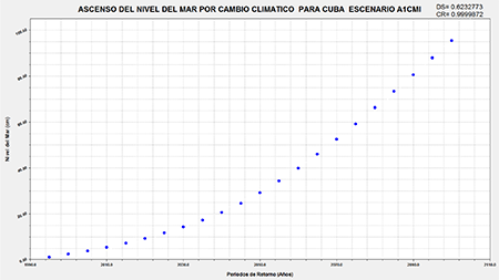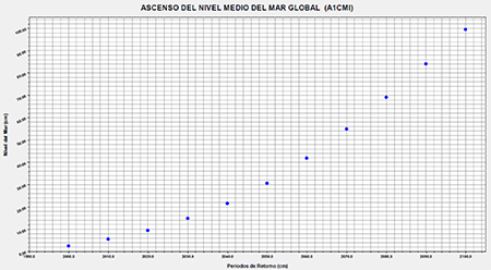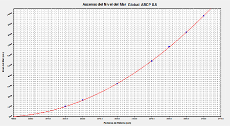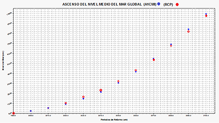 Los estudios realizados mostraron un ascenso de 27 cm para el 2050 y de 85 cm para el 2100 (Pérez Parrado et al 2006, 2008, Salas et al 2006). Después de 10 años era necesario actualizar las proyecciones futuras y por tal motivo se han realizado los cálculos de nuevo con una versión más moderna del MAGICC/SCENGEN.