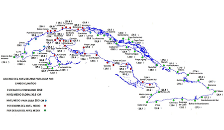El ascenso del nivel del mar debido al cambio climático es uno de los más graves problemas que debe enfrentan Cuba como estado insular. Es por eso que nuestra isla por la longitud de sus costas, sobre todo en las zonas de la plataforma con poca profundidad sufrirá inundaciones que ponen en peligro las poblaciones costeras y sus habitantes, reservorios hídricos de agua potable y varios ecosistemas sobre todo de grandes humedales. Desde principios de este siglo en el Instituto de Meteorología, se han realizado investigaciones sobre este problema, primero con la llamada directiva uno para determinar los peligros actuales y después con el denominado Macroproyecto de la Agencia de Medio Ambiente para el estudio del cambio climático, peligros futuros y su impacto en Cuba.