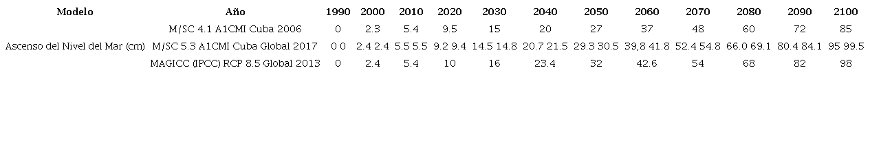 En la modelación actual del futuro escenario A1CMI y el modelo MiniCamp con la versión 5.3 del MAGICC/SCENGEN se obtienen resultados de ascenso del mar más altos (29.3cm en el 2050 y 95cm en 2100) que los calculados con la versión 4.1 en el 2006 (27 cm. en el 2050 y 85cm. en el 2100). Los nuevos valores están más acordes con los resultados ofrecidos por el IPCC en su último informe (V Informe, 2014) y otros autores y Jevrejeva et al. (2014), los mismos actualizan la información para Cuba y muestran que el impacto esperado debido al ascenso del nivel de mar en nuestro país debe ser superior a los estimados anteriores, principalmente en las zonas costeras bajas y los humedales.