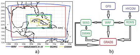 In Cuba, the first experiences in numerical modeling were acquired using the MM5V3 (Mesoscale Model Fifty generation, Version 3), which has been operationally installed at INSMET since 2005. Three nested domains were used, centered on the Republic of Cuba and with the most appropriate parameterizations for this tropical region, following the recommendations of MM5V3 manuals (PSU/NCAR, 2000; 2006) and of other INSMET specialists (Mitrani et al., 2003; Mitrani and González, 2005). Subsequently, the combinations MM5V3 + WW3 (Mitrani et al., 2011), WRF + WW3 (Mitrani et al., 2012 a) and WRF+WW3+SWAN (Pérez et al., 2013 a) were assimilated for the prediction of weather and waves in deep and shallow waters, with emphasis on the presence of tropical cyclones.