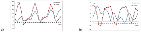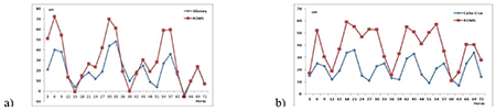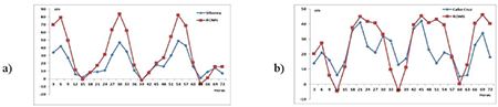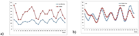 At the pass of “Charley”, the highest sea level increase, of 3.84 m, was predicted at El Cajio, while the reported value in the Hurricane Season Summary (Ballester and Rubiera, 2005) was 4 m. As shown in Figure 9 a, the graph of the model result shows more than 3.5 m for this area. At Surgidero de Batabano, the model shows an elevation between 2.5 and 3 m, while the reported value was 2.8 m. It was also possible to forecast the behavior of a moderate flooding that occurred in Havana, in the order of 0.5 to 0.8 m, when “Charley” entered the Gulf of Mexico.