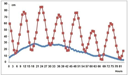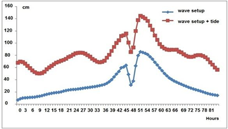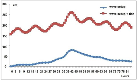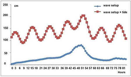 The wave setup phenomenon is best observed on steep coasts that favor its occurrence. In the present work, these effects are shown in the presence of hurricanes “Wilma” (in Havana seafront), “Hanna”( in Gibara) and “Sandy” (in the surroundings of Santiago de Cuba Bay). In these cases, tide gauges cannot register the wave setup effect in the flooding areas, because they are installed in other locations; therefore, the most real data are some local visual testimonies. But it is important to validate the astronomical tide contribution, especially in the eastern regions, where the tide maximum values of Cuban territory are registered. For this reason, Figures 14, 15, 16, 17 show the calculated wave setup values, and these values plus those of the astronomical tide ones.