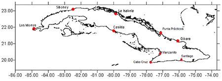 The authors which to express their gratitude to the Cuban Institute of Meteorology (INSMET) and to US National Oceanographic and Atmospheric Administration for providing the necessary information to develop the present work, as well as to Martha M. Rivero, BA., for the excellent grammar review and text correction.