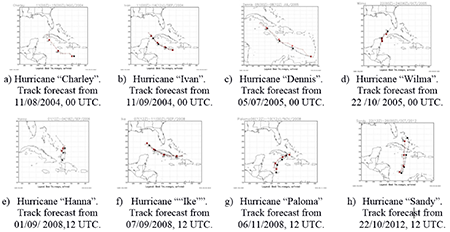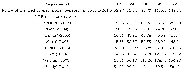 To represent the hurricane track forecast, hurricane centers were located in the sea level pressure, wind and stream function fields from WRF outputs. Hurricane tracks were assessed, using NHC (National Hurricane Center) “best tracks”. This information has been published by several authors on NHC website (NHC, 2016).