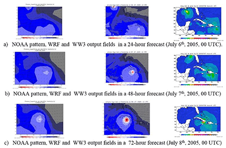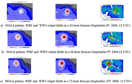 As examples, circulation patterns are shown in Figures 2.2 a, b, c and 2.3 a, b, c showed circulation patterns from the sea level pressure re-analyses (NOMAD3, 2013), in comparison with WRF outputs for sea level pressure, wind and wave height fields in presence of hurricanes "Dennis" and "“Ike”" for 24, 48 and 72-hour forecasts.