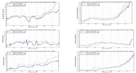 As an example, Figures 7 and 8 show the comparison of wave heights and wind speed values recorded in buoys with those forecasted in the presence of hurricanes “Dennis” and “Ike” on Figures 7 and 8.