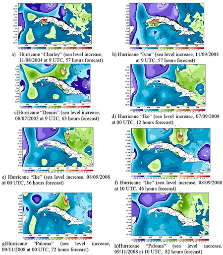 Given the fine resolution of ROMS model, with a space step of 2 km, it seems that it is not necessary to introduce a parametric cyclone or a mobile mesh for the efficient representation of sea level increase in shallow water areas. This advantage is observed in Figures 9 (a-h), when hurricanes “Charley”, “Ivan”, “Dennis”, “Ike” and “Paloma” were located near the shore line, generating a sea level increase by storm surge. The maximum values of the sea level increase correspond to those reported in the hurricane season summaries (Ballester and Rubiera 2005,2006, 2009), prepared at INSMET.