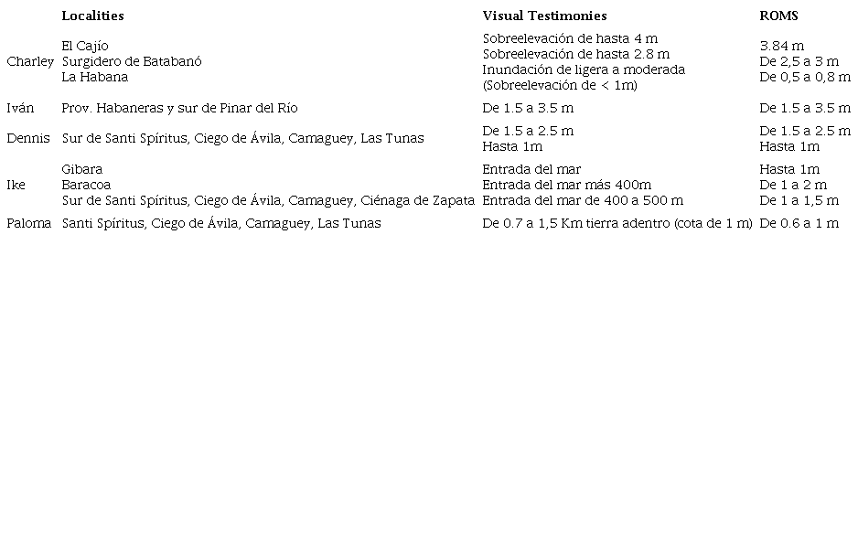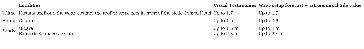 Table 5 shows a comparison between ROMS outputs for sea level rise and some visual testimonies, taken from hurricane season summaries (Ballester and Rubiera 2005,2006, 2009) and from the archives of the Marine Meteorological Center (CMM) and the Meteorological Center of Holguin Province (CMPH).