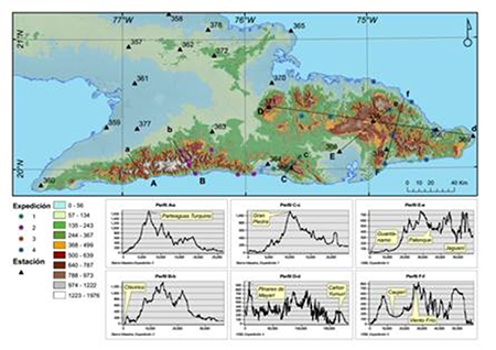 El área de estudio es la zona montañosa de la región oriental de Cuba (figura 1), integrada por las subregiones: Grupo Orográfico de Sagua Baracoa y Sierra Maestra, además del área Sierra de la Gran Piedra, (Nuñez & Viña, 1989). Estos conjuntos constituyen la región más montañosa del país. En esta zona se pueden encontrar cordilleras (perfiles A-a, B-b y C-c de figura 1); Valles intramontanos como el de Palenque (perfil E-e de figura 1); y cuchillas (perfiles D-d y F-f de figura 1). En el área de estudio se encuentran algunos de los núcleos de biodiversidad más importantes del Caribe (TNC, 2018) mucho de los cuales están muy localizados y presentan alto grado de endemismo (Fong G. et al., 2005; Maceira et al., 2005), lo que es indicador de alta variabilidad microclimática.