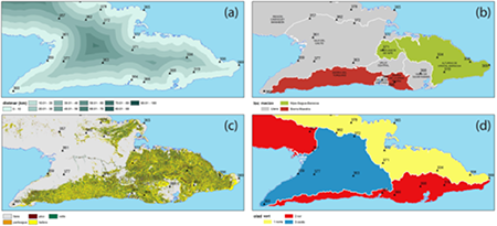 Las zonas geográficas se derivaron del mapa de regiones naturales y antrópicas escala 1:3000000 publicado en el Nuevo Atlas Nacional de Cuba (Nuñez & Viña, 1989). Se utilizó el nivel de agrupamiento de subregión, uniendo las relacionadas desde el punto de vista climático. La escala se adecuó a la de trabajo, 1:100000, utilizando como base los derroteros oficiales de las regiones especiales de desarrollo sostenible Sierra Maestra y Nipe-Sagua-Baracoa, y el DEM (figura 2b).