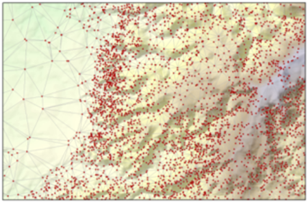 Primeramente se utilizó el algoritmo RRQRR (Reverse Randomized Quadrant-Recursive Raster) para mapear el espacio bidimensional del área de estudio a un espacio unidimensional. En este espacio cada locación quedó distribuida en forma balanceada. En segundo lugar un mapa raster de probabilidad de inclusión (valores entre 0 y 1 inclusivo) asignó diferentes probabilidades de selección a cada pixel del área de estudio sobre sus vecinos. En este caso el mapa de probabilidad se creó a partir de la desviación estándar de la altura en la vecindad circular de un punto con un radio de 1km. En la figura 3 se puede apreciar que esta distribución irregular efectivamente presentó mayor densidad en zonas de laderas donde la aparición de microclimas es más probable.
