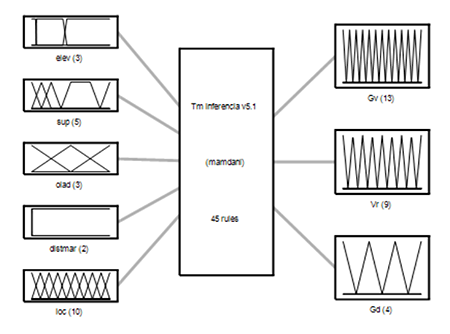 La decisión de qué gradientes y estaciones meteorológicas de referencia utilizar en cada punto del terreno fue modelada por un motor de inferencia difusa tipo Mamdani. Este tipo de motor de inferencia se define a partir de conjuntos de entradas, salidas, reglas, términos de entrada y de salida (Mamdani, 1974). Para este resultado las variables y términos de entrada fueron definidos por criterios de expertos a partir de los factores formadores del clima local identificados. Como variables y términos de salida se definieron los gradientes vertical y horizontal a utilizar y la estación meteorológica de referencia. El número, rango y tipo de las categorías de todas las variables que toma en cuenta el motor de inferencia difusa, dependen de la variable climática estudiada.