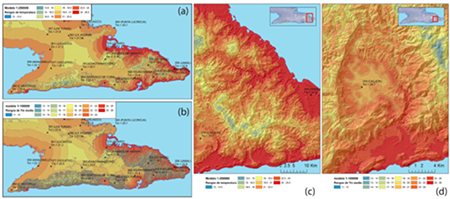De los mapas resultantes se observa en la figura 5 que representan correctamente las inversiones de temperatura en los valles, especialmente en Sierra Maestra. El Valle de Caujerí (detalle en figura 5 d) y otros valles intramontanos de la vertiente sur del macizo Nipe Sagua Baracoa, son tratados correctamente. Se representa una gran variabilidad espacial de la temperatura a ambas escalas (figura 5 a y b), sobre todo en zonas de alturas medias de las cuencas, lo que es consecuente con los efectos esperados de los elementos formadores de clima.