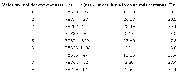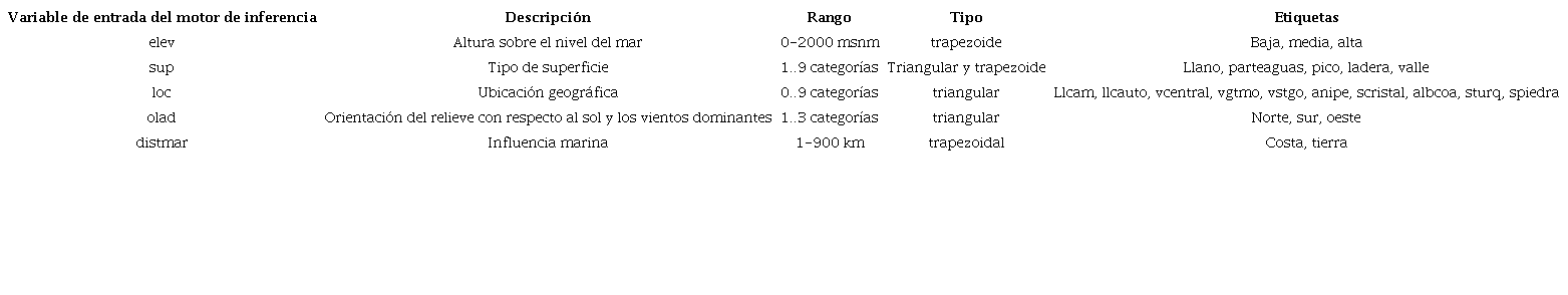 Se construyó un motor de inferencia difusa para la variable climática temperatura mínima media. Para cada variable de entrada del motor fueron identificados los rangos, tipo de variable y etiquetas asociadas, (tabla 1). Las variables de salida del motor fueron también definidas, ajustadas a los resultados del estudio utilizado como base. La tabla 2 describe el resultado de la definición de las variables de salida del motor de inferencia. El número de etiquetas de los gradientes se corresponde con el número de gradientes identificados en el estudio base, los cuales se muestran en la tabla 3. La tabla 4 describe las estaciones de meteorológicas referencia y las temperaturas mínimas medias, serie 1986-2015, utilizada en el motor de inferencia.