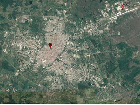 De febrero del 2011 a diciembre del 2016 se llevaron a cabo mediciones del espesor óptico de los aerosoles (EOA) en el centro de la ciudad de Camagüey (CMW) y en el Centro Meteorológico (CMP), situado a aproximadamente a 8 Km de dicha urbe (Figura 1). Estas mediciones se realizaron de forma alterna e irregularmente utilizando un único fotómetro Microtops II, durante 167 días (1934 observaciones) en la CMW y 284 días (2227 observaciones) en el CMP.