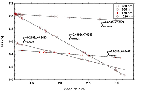El fotómetro se calibró empleando el método de Langley (Figura 2), este procedimiento se basa en la ley de Bouguer-Lambert: