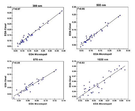 En el CMP se encuentra instalado un fotómetro CIMEL perteneciente a la red RIMA que es calibrado periódicamente. Para comparar las mediciones de ambos instrumentos y comprobar la calidad de las observaciones del MICROTOPS II, se tomaron mediciones realizadas en ±30 segundos. Los resultados se muestran en la figura 3, donde se observa que los coeficientes de regresión de los canales coincidentes en ambos instrumentos están por encima de 0.80. El canal de 1020 nm presenta la peor correlación (0.82), este resultado puede estar influenciado por variaciones en el contenido de vapor de agua en los intervalos de comparación, el canal no se utilizará en este trabajo.