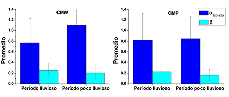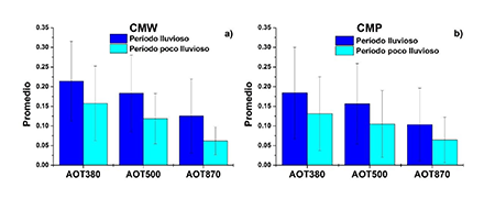 En la figura 4 se observa que, en ambos sitios de mediciones, el EOA es superior durante el período lluvioso, siendo ligeramente menor en el CMP con relación a la ciudad. La desviación estándar es mayor en el CMP, hecho que indica una mayor variabilidad diaria de las características de los aerosoles en este sitio con respecto a CMW. También, esta variabilidad es mayor durante el período lluvioso, en ambos lugares. El EOA en la ciudad durante el período lluvioso, en los 380, 500 y 870 nm, alcanza los valores de 0.21±0.10, 0.18±0.10 y 0.13±0.09 respectivamente; en el período poco lluvioso los valores correspondientes al EOA en las longitudes de onda señaladas son 0.16±0.09, 0.12±0.06 y 0.06±0.04. En el caso del CMP estos valores son 0.18±0.12, 0.16±0.10 y 0.10±0.09 para el período lluvioso y de 0.13±0.09, 0.10±0.09 y 0.06±0.06 respectivamente, para el período poco lluvioso.
