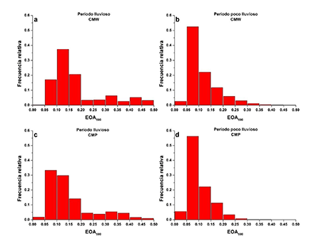 En el CMP la distribución de frecuencias (Figura 6c) muestra que, durante el periodo lluvioso, el pico se alcanza en el intervalo de 0.05 -0.10, el 76 % de los casos se encuentra entre 0.05 y 0.20, también se observa una mayor dispersión en los valores del EOA500. En el periodo poco lluvioso (Figura 6d), muestra similitud entre los dos puntos de medición, encontrándose el máximo de los casos en el rango 0.05-0.10 y el 89% de los casos se encuentra entre 0.05-0.20.