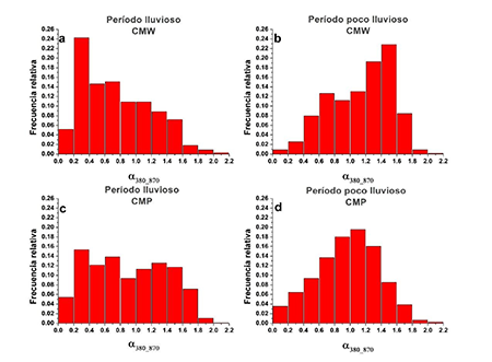 En las figuras 7c y d aparecen las distribuciones de frecuencia para el CMP, puede observarse que existen diferencias en relación a las distribuciones de CMW. Si bien en la ciudad las distribuciones de frecuencias están agrupadas en extremos opuestos de los gráficos, en el CMP no ocurre así. También, como se destacó anteriormente, el valor medio de α380-870 prácticamente no difiere entre un período y otro. La distribución de frecuencias aparece más “aplanada” en el período lluvioso, indicando una presencia bastante equilibrada de aerosoles finos y gruesos, con un ligero predominio de estos últimos (59% vs 41%).