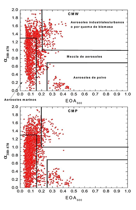 Los valores limites varían según los autores, basados en estudios previos (Kaskaoutis et., al, 2011). Se tomaron los siguientes valores frontera: 1) valores del espesor óptico menores a 0.1 y de α380-870 < 1.3 corresponden a los aerosoles de origen marino, 2) EOA500 > 0.2 y α380-870 > 1.0 caracterizan a los aerosoles urbanos/industriales o por quema de biomasa, 3) los aerosoles de polvo (polvo suspendido, polvo del Sahara) se enmarcan en EOA500 > 0.25 y α380-870 < 0.7, el resto de los casos que no caen dentro de los limites antes especificados se denominan aerosoles mezclados.