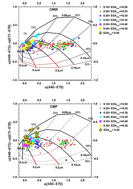Mientras que el EOA500 depende de la carga de aerosoles en la columna de la atmosfera, α380-870 caracteriza la distribución de tamaño de las partículas, por tanto, el diagrama de dispersión EOA500 vs α380-870 indica cualitativamente la cantidad y dimensión de los aerosoles. La combinación de ambos parámetros facilita diferenciar los tipos de aerosoles, discriminar entre los aerosoles finos y gruesos, también basados en el hecho que tanto el EOA500 como α380-870 dependen fuertemente de la longitud de onda. Los aerosoles, en este tipo de diagrama, habitualmente se clasifican según su origen, en aerosoles marinos, antropogénicos (urbano/industrial), por quema de biomasa, aerosoles de polvo del desierto y como aerosoles mezclados, aquellos que no caen dentro de la clasificación anterior.