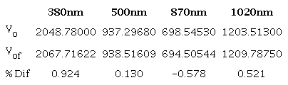 La Tabla 1 muestra los coeficientes de las calibraciones originales (Vo) y los hallados por el método de Langley (Vof). La diferencia entre los coeficientes de calibración, no supera el 1%, por lo que se decidió mantener los coeficientes originales en el cálculo del espesor óptico.