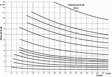 A partir de esta ecuación se pueden obtener diagramas como el de la figura 1, que permiten determinar la potencia de la ola en kW por metro de frente de onda.