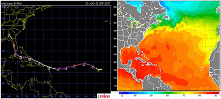 La figura 2 muestra la trayectoria final de Irma según http://hurricanes.ral.ucar.edu/repository/data/bdecks_open/ , y el campo de temperatura superficial del mar en el océano Atlántico norte del día 9 de septiembre, que mostraba valores entre 85 y 88º F (de 29 a 31º C) en el mar Caribe y golfo de México, muy favorables al fortalecimiento del ciclón tropical.