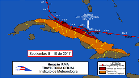 Entre el 8 y 10 de septiembre de 2017, el huracán Irma desarrolló una trayectoria de máximo peligro para la costa norte de Cuba, con rumbo Oestenoroeste desde los mares al norte de Guantánamo y Holguín que lo llevó a tocar tierra en Cayo Romano, al norte de la provincia Camagüey, y continuar por la costa norte de las provincias Ciego de Ávila, Sancti Spíritus y Villa Clara.