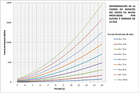 El resultado de la energía de la ola se obtiene en joules (J), el cual debe ser multiplicado por un factor de 0,101971610-3 para expresarlo como potencia de impacto de la ola en kilojoule por metro lineal de costa (kJ/m). Con la solución de esta ecuación sobre una hoja de cálculo de Microsoft Excel, ha sido posible construir el nomograma representado en la figura 8, que asocia la altura de la ola significativa y su período en aguas profundas con los valores correspondientes de potencia de impacto sobre el fondo marino y el muro.