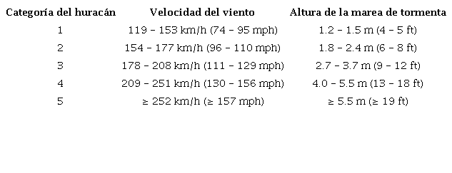 Se muestra también la escala de intensidades de los huracanes de acuerdo con las velocidades del viento, y su relación con las surgencias ciclónicas asociadas. Esta fue creada en 1971 por Herbert Saffir (ingeniero civil) y Robert Simpson (meteorólogo, especialista en ciclones tropicales) para uso del servicio meteorológico de Estados Unidos, y rápidamente adoptada por el resto de los servicios meteorológicos en la zona tropical, por recomendación de la OMM (ver tabla 1).