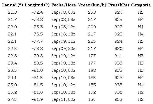 Por su parte, la serie de posiciones de la tabla 2 muestra que el 9 de septiembre en el norte de Matanzas, el huracán tenía categoría 3, pero a partir de la medianoche del día 10 se volvió a intensificar a categoría 4 (ver figura 4). Durante ese período, la costa de La Habana recibía vientos entre 100 y 110 km/h con rachas huracanadas.