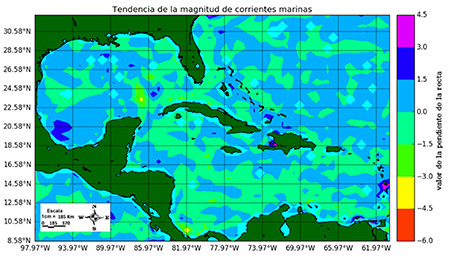 En el análisis de la tendencia de la magnitud de las corrientes marinas (Figura 13) ha sido interesante realizar una subdivisión a la región en tres zonas: Mar Caribe, Golfo de México y el Atlántico Cercano o Próximo. La figura 13, resultado del procedimiento mencionado, es muy útil para identificar las zonas de cambio ascendente y descendente; incluso aquellas donde el cambio es significativo (-1.5 > m > 1.5 ).