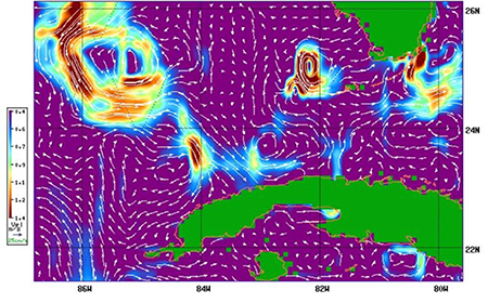 Asociado con la Corriente de La Florida (CF) y la curvatura anticlónica de la Corriente de Lazo (CL), en la entrada oeste del estrecho, existe el Vórtice Anticlónico de Mesoescala a lo largo de la costa norte cubana. Su dinámica e interacción con los sistemas de corrientes ha sido analizado por autores de la región empleando satélites, derivadores y datos de boyas (Kourafalou et al., 2017). Dos tipos de remolinos son caracterizados: una celda anticiclónica principal, dentro del núcleo de la Corriente del Lazo como una extensión (tipo A) y un remolino anticiclónico individual que saliendo del propio núcleo es desplazado hacia el este a lo largo de la costa norte cubana (tipo B).