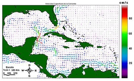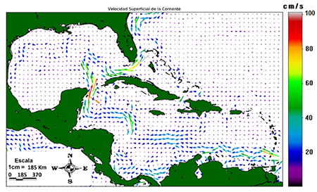 En la corriente de Las Antillas se ratifica que la velocidad promedio es inferior a los 10 cm/s y su tránsito se dirige desde las Antillas Menores por el borde exterior de Las Bahamas.